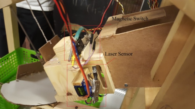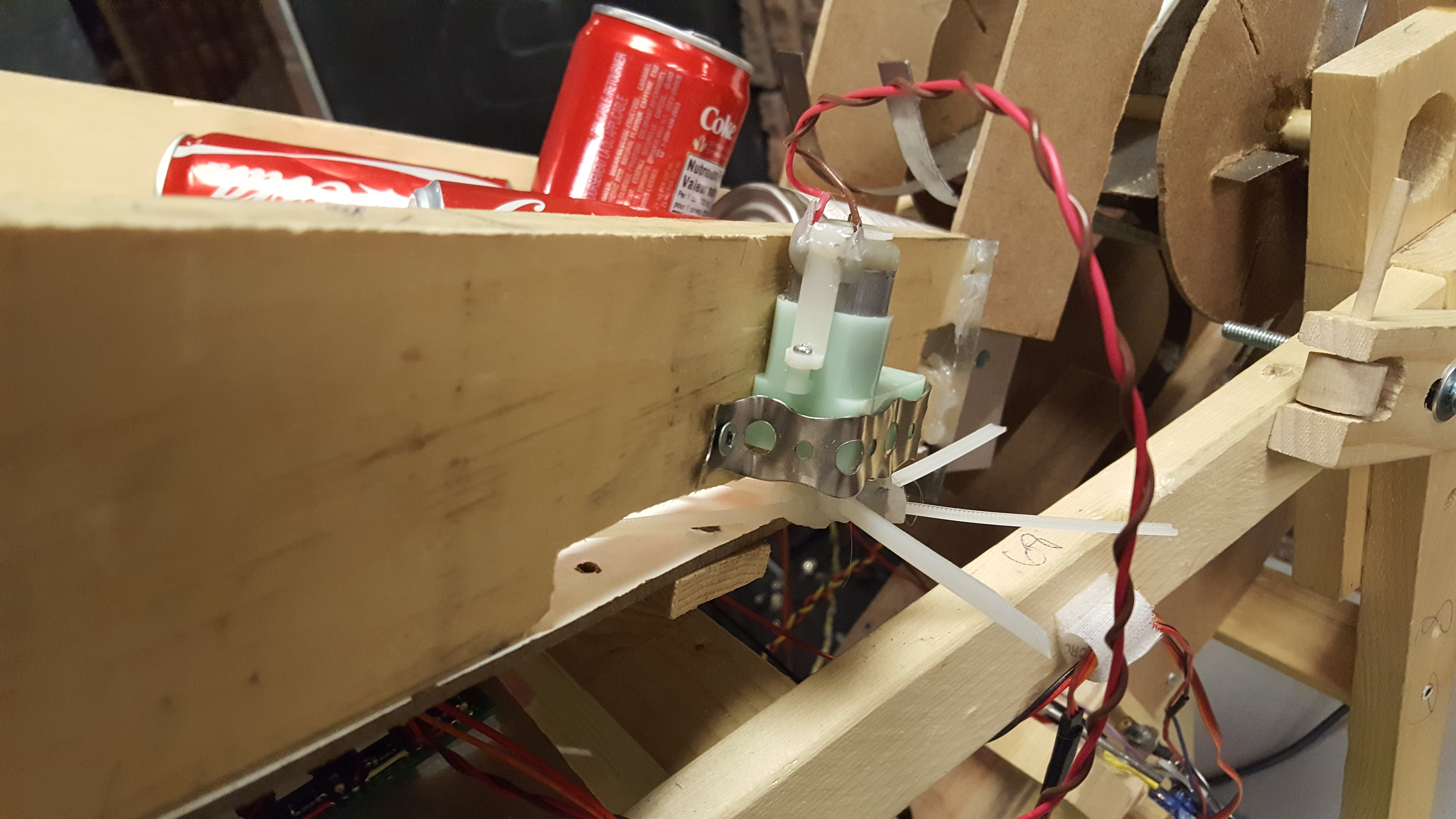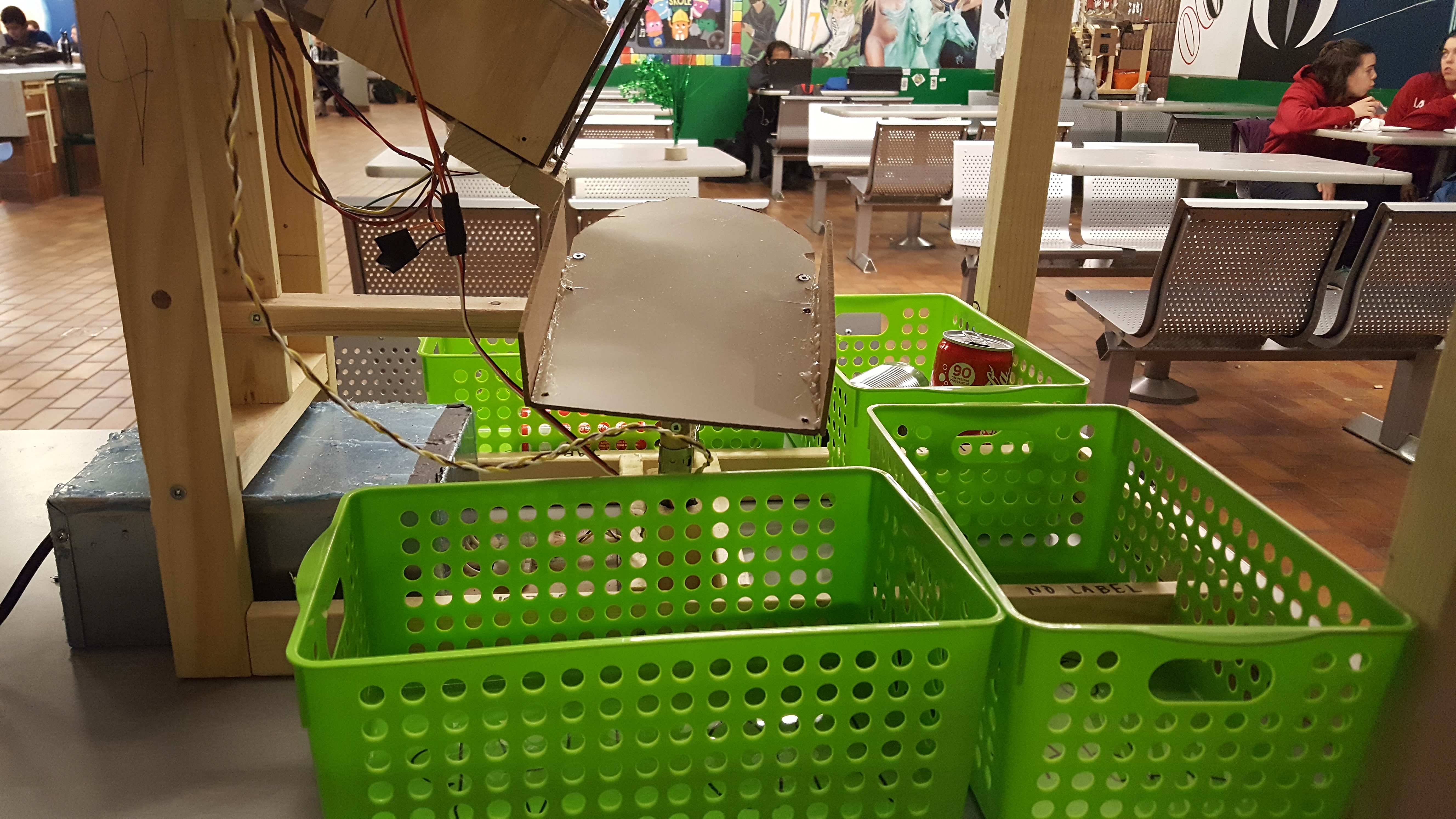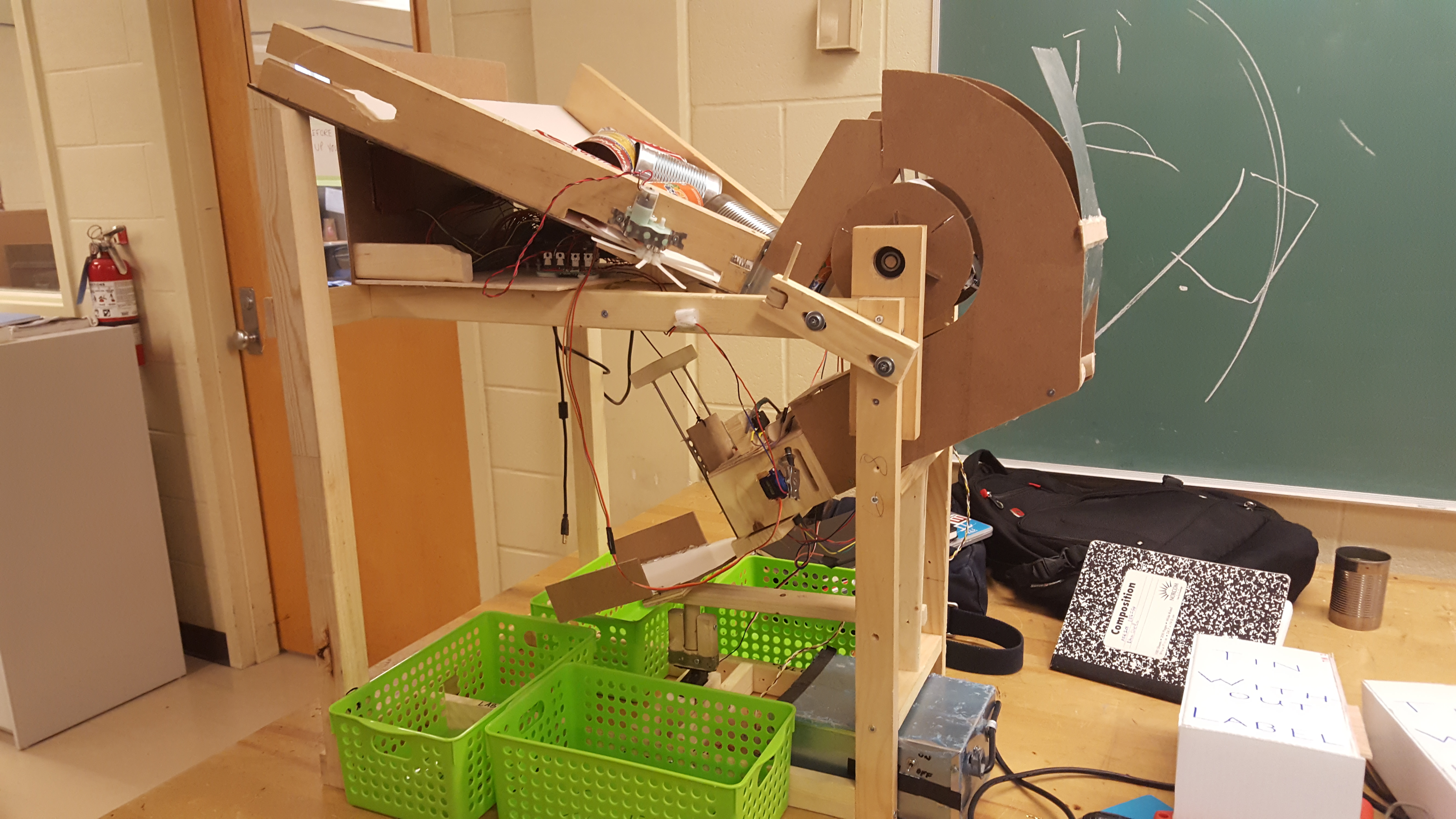 This was a fully autonomous can sorting machine which my two teammates and I had built for a design course, AER201, in our 2nd year. The goal of the project was to sort four types of cans; aluminum pop can with tab, aluminum pop can without tab, tin soup can with label and tin soup can without label. Twelve assorted cans had to be sorted within three minutes. The first step in the cycle was for the "claw" to pick up a single can from the hopper and drop it into our "sensing channel". Here, we used a magnetic switch to determine if the can in the channel was a tin or aluminum can. If it was determined to be an aluminum can, we then used a carefully calibrated laser sensor to check if there was a tab on the aluminum can or not. It did not matter if the can was inverted or not because even if it was, the can stood a little taller because of the tab, which was then picked up by the laser sensor. If the can was determined to be a tin can, then we used a colour sensor to check if the can had a label or not. Once the type of can was determined, we used a ramp on a servo to guide the can into the correct bin. This cycle was repeated until all the cans were sorted.